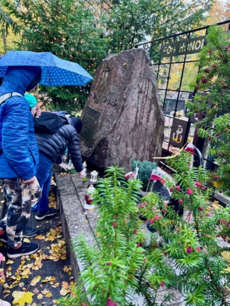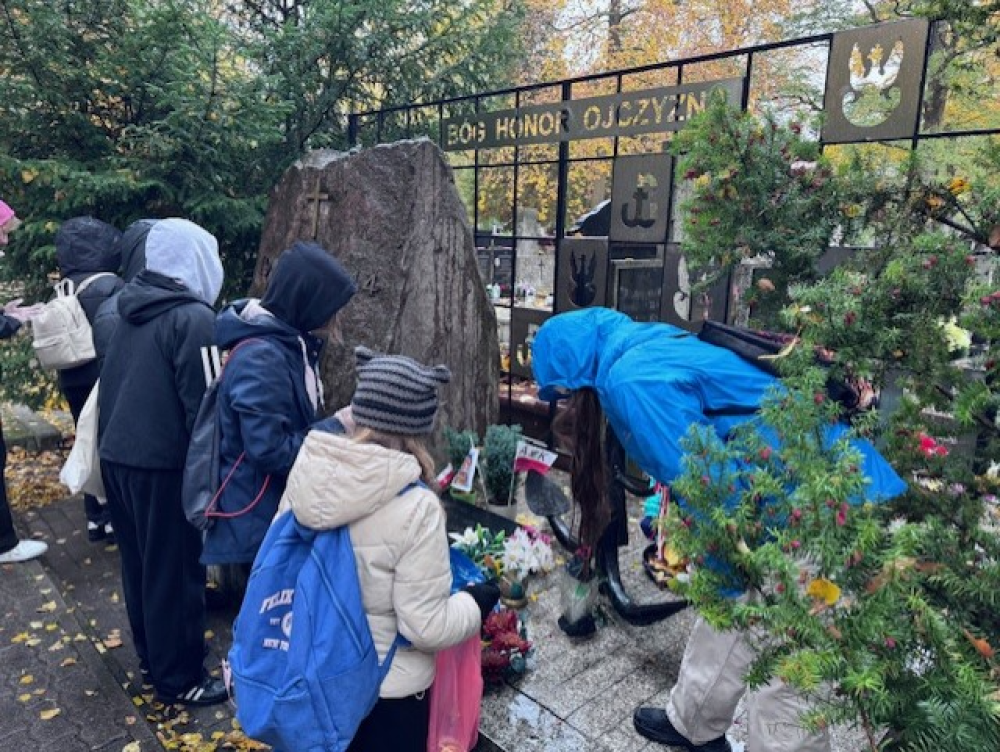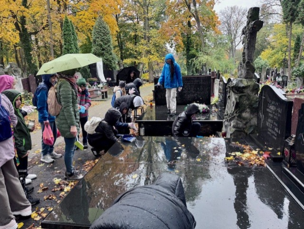 Cmentarz Bródnowski, jedna z największych nekropolii Europy, jakoś szczególnie nie kojarzy się z powstaniem warszawskim. Co innego Powązki Wojskowe, czy Cmentarz Wolski „Polegli-Niepokonani”. Nie oznacza to jednak, że nie znajdziemy na nim grobów powstańców, bo są i to w znacznej ilości. Zresztą nie tylko powstańcze: na naszym lokalnym cmentarzu znajduje się również wiele symbolicznych miejsc pamięci, poświęconych nie tylko poległym powstańcom, ale również pomordowanym polskim oficerom w Katyniu, czy ofiarom komunistycznych czystek w pierwszych latach po II wojnie światowej. Naszym zadaniem było zadbać o nie: uporządkować, zapalić biało-czerwone znicze i minutą ciszy uczcić pamięć poległych. Tak też się stało. Mimo że tego dnia, w sobotę, 18 października, pogoda grała wybitnie przeciwko nam (wiało i lało-chyba już gorzej być nie mogło) grupa przeszło 20 wolontariuszy z klas 4-8 spełniła postawione cele. Dla nas wszystkich była to nie tylko praca w szczytnym celu, ale również lekcja i historii i patriotyzmu, i dbałości o nasze wspólne dobro jakim są cmentarze – kotwice pamięci naszego narodu.