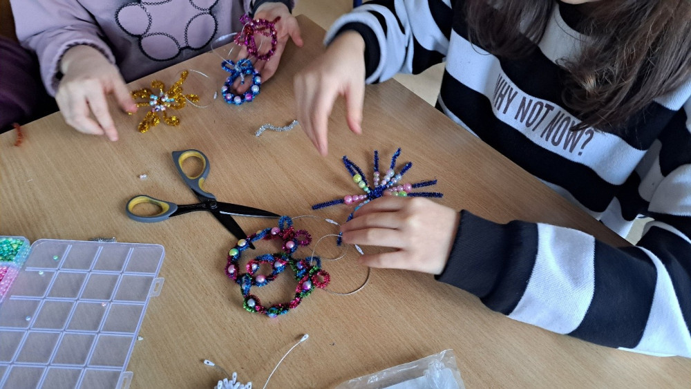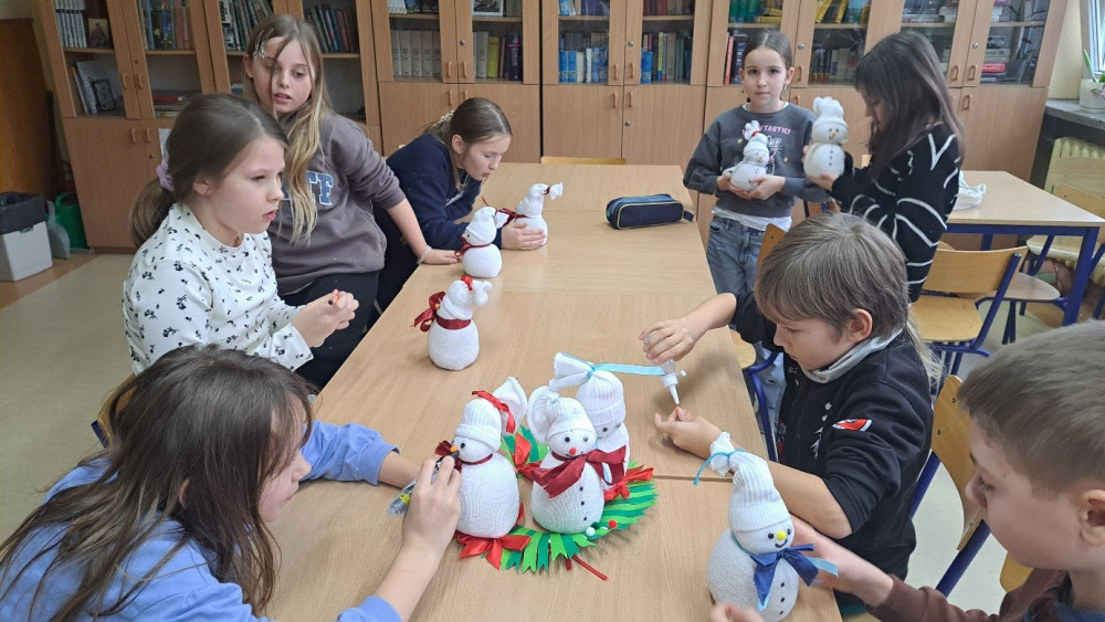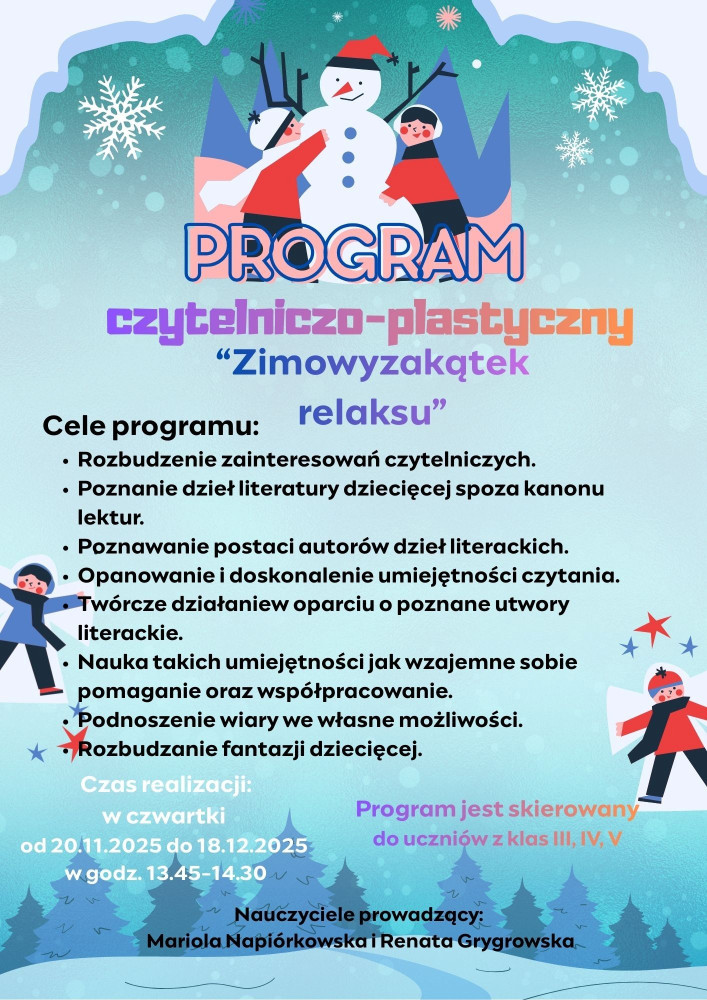 W przedświątecznym czasie dzieci z klasy IV uczestniczyły w Programie czytelniczo-plastycznym „Zimowy kącik relaksu”, który powstał z myślą o uczniach klas III, IV i V SP. Miał on na calu rozwijanie u dzieci przede wszystkim umiejętności plastycznych, ale także poznanie utworów zaliczających się do klasyki, jak i współczesnych. Stąd wybór wierszy takich autorów jak Ludwik Jerzy Kern, czy książka wydana w Polsce w 2024 r. autorstwa Matildy Woods z uniwersalnym przekazem zarówno dla dzieci, jak i dorosłych. Zajęcia realizowane w ramach programu miały jeszcze inny z nadrzędnych celów, przede wszystkim miały relaksować, wprowadzać w atmosferę świąt Bożego Narodzenia, kiedy to przy dźwięku kolęd powstają najpiękniejsze ozdoby choinkowe i pielęgnowane są zwyczaje oraz tradycje bożonarodzeniowe.