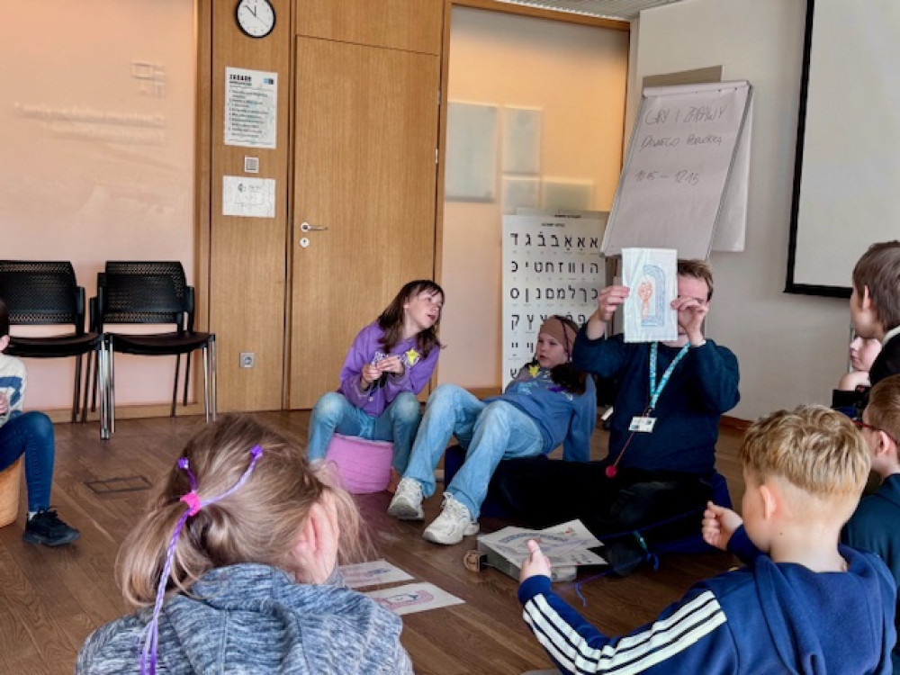 Dzieci, niezależnie od kultur i religii, lubią się bawić, to nie podlega wątpliwości i nie ulega zmianie. Jedynie różnić się mogą w zakresie ulubionych gier i zabaw. W środę, 22 kwietnia, uczniowie klasy 4a mieli okazję przekonać się jakie zabawy wypełniały czas wolny naszych pradziadków przed stu laty - dzieciaków z warszawskich podwórek, z których aż co trzecie było wyznania mojżeszowego. Warsztaty były bardzo aktywizujące: najpierw poznaliśmy historię trójki przyjaciół, młodych lokatorów kamienicy przy ulicy Nowolipie, następnie odwiedziliśmy fragment wystawy stałej, aby przyjrzeć się życiu warszawskiej ulicy okresu międzywojennego, potem każdy wykonał własnoręcznie zabawkę jaką bawiły się ówczesne dzieci, zaś na sam koniec rozegraliśmy partyjkę drejdla - ulubionej gry żydowskich dzieci. Dużo się dowiedzieliśmy, dobrze przy tym bawiąc; dla niektórych z nas był to pierwszy kontakt z kulturą żydowską i judaikami.