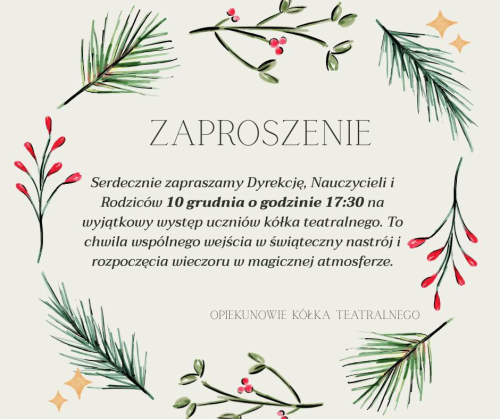 10 grudnia o godzinie 17:30 w sali gimnastycznej uczniowie naszej szkoły z kółka teatralnego serdecznie zapraszają Dyrekcję, Nauczycieli oraz Rodziców na część artystyczną wprowadzającą w świąteczny nastrój.